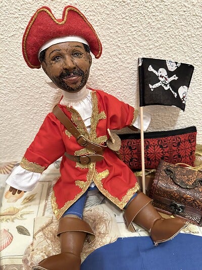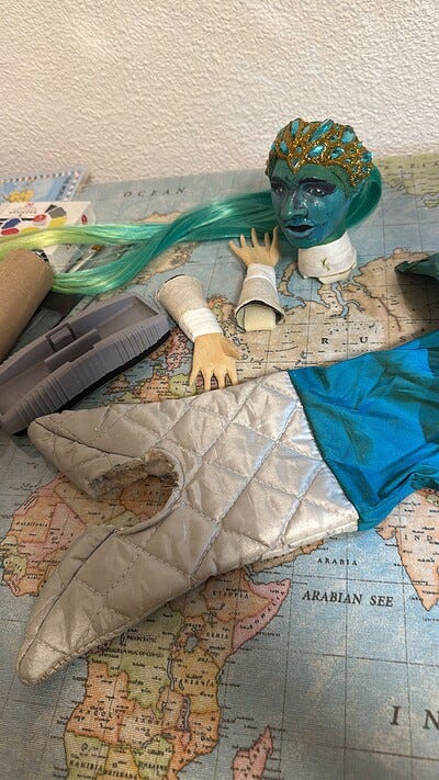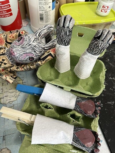 Paint heads and hands. Finish sewing clothing and attach everything together. Final clear-coat spray done at home once fully dry.