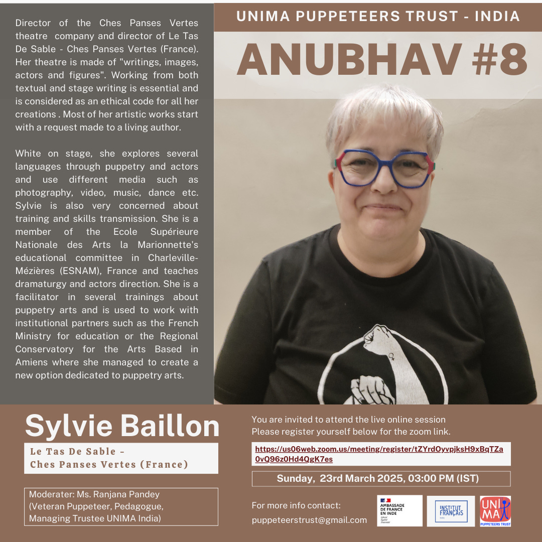 We are excited to share details about the upcoming event, "Anubhav #8", featuring the esteemed Sylvie Baillon from Le Tas de Sable - Ches Panses Vertes (France). Sylvie, the director of the Ches Panses Vertes theatre company, brings a wealth of knowledge and experience to her craft.