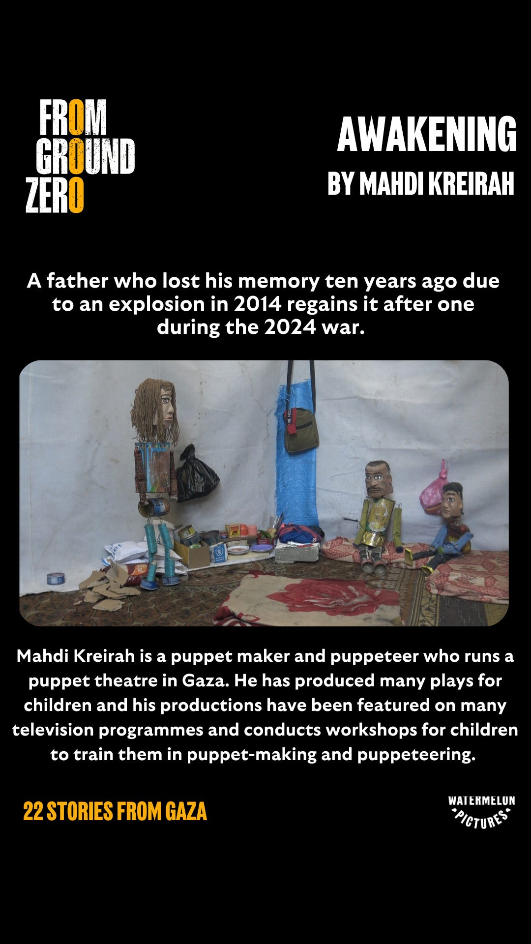 A deeply moving documentary following Mahdi as he transforms the rubble of Gaza into puppets. Through Mahdi’s creative process and the poetry of Jawad al-Aqqad, the film captures art as a form of resistance, tenderness and survival.