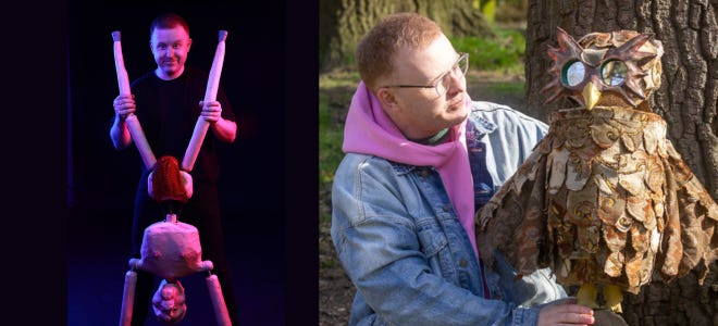 Past work includes building skeletal crow spirits for immersive EDM festivals, puppet-making for Winnie-The-Pooh at Brighton Open Air Theatre, and creating an octogenarian acrobat who dances to Whitney Houston.